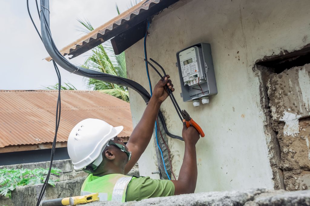 Wafanyakazi wa TANESCO Mkoa wa Temeke wakimuunganishia nishati ya umeme Nyumba ya Mzee Maulid Ngakonda.