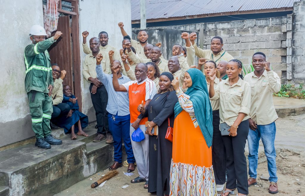 Wafanyakazi wa TANESCO Mkoa wa Temeke, Uongozi wa Serikali ya Mtaa wa Mzinga A, Mzee Maulid Ngakonda wakiwa katika picha ya pamoja baada ya kumaliza zoezi la kumuunganishia nishati ya umeme.