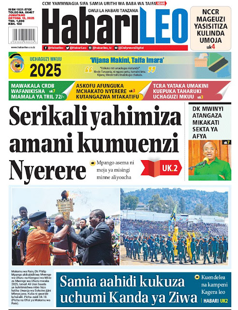 MagazetiMAGAZETI YA TZ LEO J'TANO OCT 15,2025 Admin4 hours ago01 mins 3 Post navigation Previous: MRADI WA UTAFITI WA UCHIMBAJI MAFUTA NA GESI WAFIKIA PAZURINext: Vizuizi vipya vya mtandao wa Taliban huweka Afghanistan nje ya uangalizi wa ulimwengu – maswala ya ulimwengu