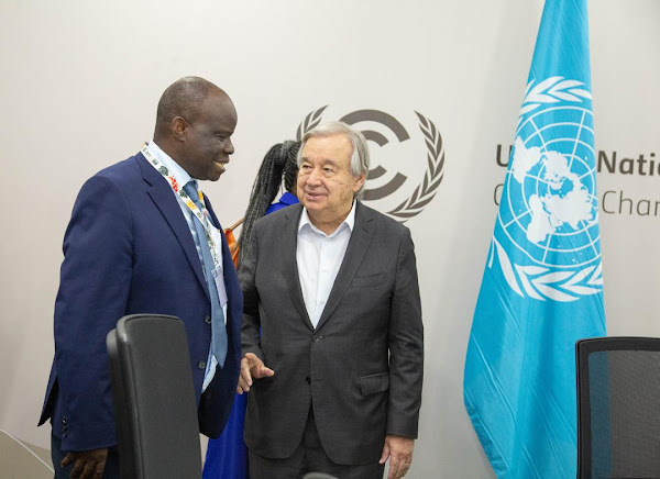 KATIBU Mkuu wa Umoja wa Mataifa, António Guterres (kulia), akizungumza na Mjumbe Maalum na Mshauri wa Rais kuhusu Mazingira na Mabadiliko ya Tabianchi, ambaye pia ni Mwenyekiti wa Kundi la Majadiliano la Afrika kuhusu Mabadiliko ya Tabianchi (AGN), Dkt. Richard Muyungi, aliyekuwa akiongoza ujumbe wa mawaziri wanane wa Afrika kuwasilisha misimamo ya bara hilo katika majadiliano yanayoendelea kwenye mkutano wa COP30 uliofanyika Belem, Brazil, leo.