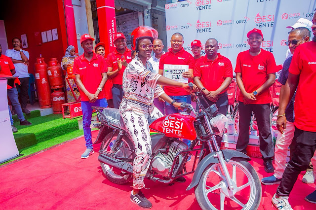 Irene Godfrey ambaye ni mkazi wa wa Mbezi Beach Jijini Dar es Salaam akiwa na pikipiki ambayo amekabidhiwa na baada ya kutangazwa mshindi wa Kampeni ya GESI YENTE inayoendeshwa na Kampuni ya Oryx Gas Tanzania ikiwa na lengo la kuhamasisha matumizi ya Nishati Safi ya Kupikia. Hafla hiyo imefanyika leo Desemba 1, 2025 Jijini Dar es Salaam. Wengine katika picha ni Maofisa wa Kampuni ya Oryx Gas Tanzania.