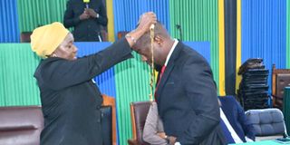 Mkuu wa Wilaya ya Nyamagana, Amina Makilagi (kushoto), akimkabidhi vitendea kazi, Mstahiki Meya wa Halmashauri ya jiji la Mwanza, Sima Constantine Sima (kulia) baada ya kuthibitishwa na baraza la madiwani. Picha na Damian Masyenene