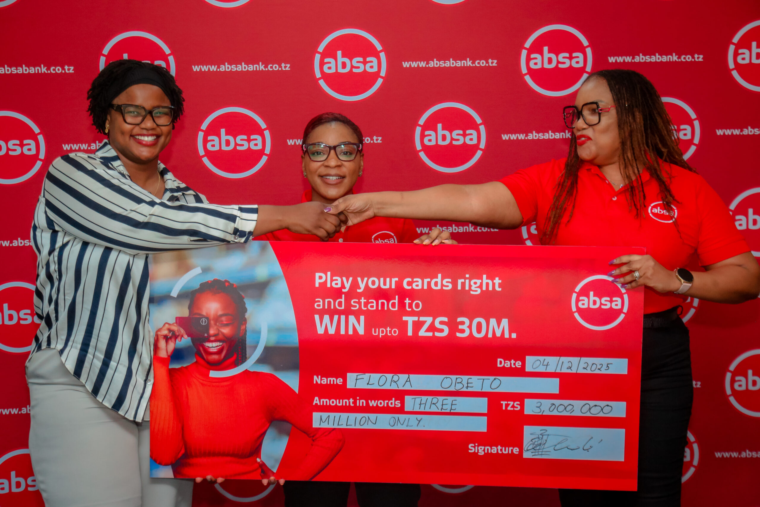 Mmoja wa washindi wa droo ya kwanza ya Kampeni ya ‘Ujanja ni Kuswipe na Kadi ya Absa’, Bi. Flora Obeto (kushoto), akipokea mfano wa hundi ya shs milioni 3 kutoka kwa Mkurugenzi wa Wateja Binafsi, Bi. Ndabu Swere (kulia), katika hafla  iliyofanyika pamoja na droo ya pili ya kampeni hiyo jijini Dar es Salaam leo. Katika droo hiyo, Bw. Joseph Mafuru alishinda shs milioni 3, Bi. Xuan Lou, shs milioni 5 na Dk. Fauz Twain alijishindia shs milioni 10. Katikati ni Meneja Huduma za Jamii na Matukio wa Absa, Bi. Abigail Lukuvi. Mkurugenzi wa Wateja Binafsi wa Benki ya Absa Tanzania, Bi. Ndabu Swere (katikati), akizungumza jijini Dar es Salaam leo katika hafla ya droo ya pili ya Kampeni ya ‘Ujanja ni Kuswipe na Kadi ya Absa’ ambapo pia mshindi wa droo iliyopita, Bi Flora Obeto  (wa pili kushoto), alikabidhiwa zawadi yake ya fedha taslimu kiasi cha shs milioni 3. Katika droo hiyo, Bw. Joseph Mafuru alishinda shs milioni 3, Bi. Xuan Lou, shs milioni 5 na Dk. Fauz Twain alijishindia shs milioni 10. Kutoka kushoto ni Meneja Huduma za Jamii na Matukio wa Absa, Bi. Abigail Lukuvi  na Mwakilishi wa Bodi ya Michezo ya Kubahatisha, Neema Tatock.