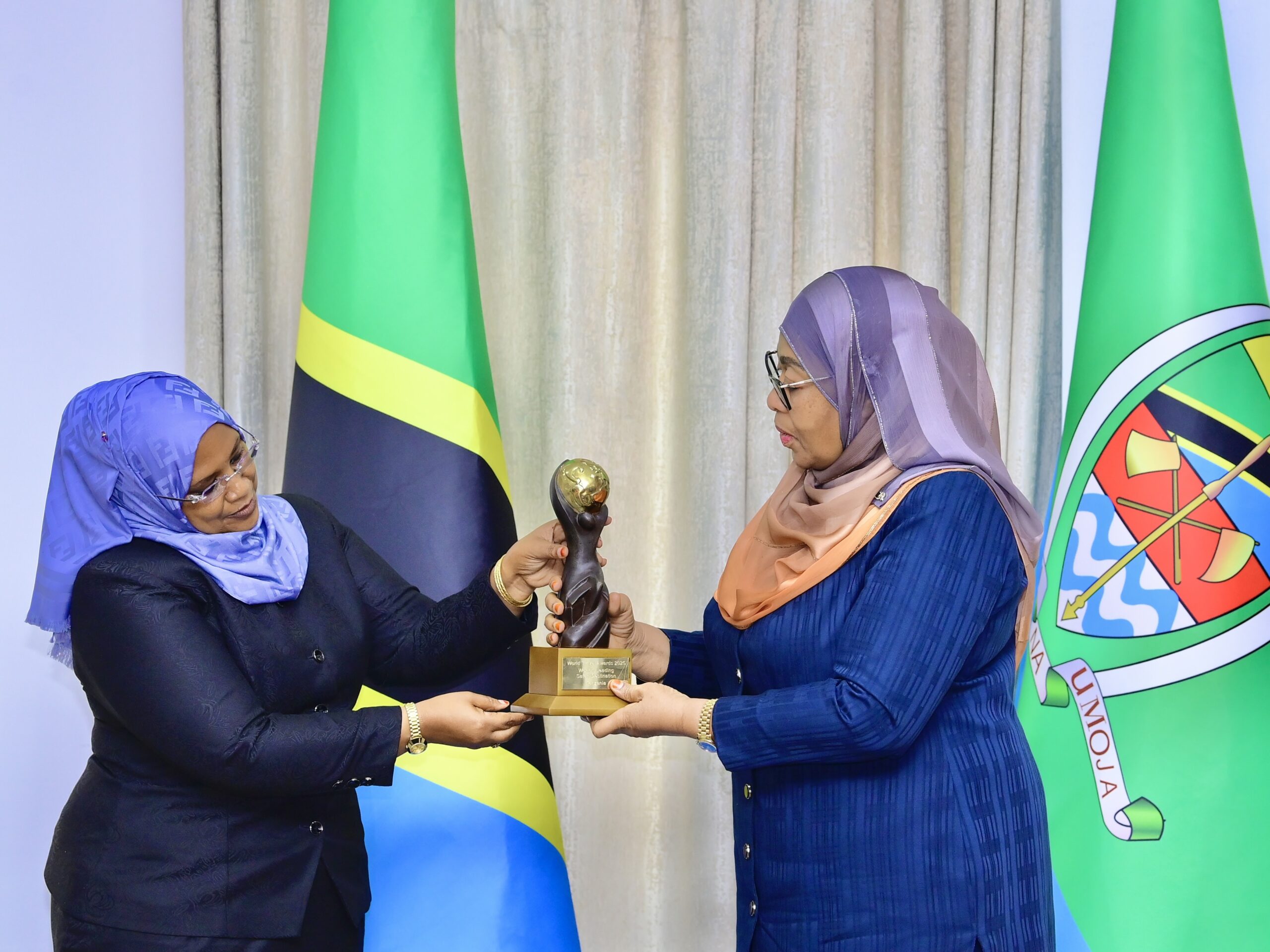 RAIS wa Jamhuri ya Muungano wa Tanzania Mhe. Dkt. Samia Suluhu Hassan apokea Tuzo tatu za Utalii za “WORLD TRAVEL AWARDS” ambazo Tanzania imeshinda, Ikulu Ndogo ya Tunguu, Zanzibar.