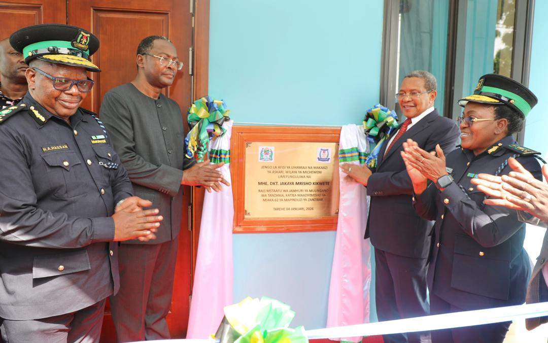 Rais Mstaafu wa Serikali ya Jamhuri ya Muungano wa Tanzania, Dkt.Jakaya Mrisho Kikwete, akikata utepe kuashiria Uzinduzi wa Jengo la Afisi ya Uhamiaji na Makazi ya Askari lililopo wilayani Micheweni, mkoa wa Kaskazini Pemba, watano kushoto ni Waziri wa Mambo ya Ndani ya Nchi,George Simbachawene,watatu kulia ni Waziri wa Nchi Afisi ya Makamu wa Pili wa Rais(SMZ),Hamza Hassan Juma na wanne kulia ni Kamishna Jenerali wa Uhamiaji, Dkt. Anna Makakala.Uzinduzi huo ni sehemu ya Maadhimisho ya Sherehe za Miaka 62 ya Mapinduzi ya Zanzibar.Picha na Wizara ya Mambo ya Ndani ya Nchi