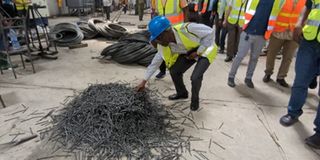 Naibu Waziri Ofisi ya Rais Mipango na Uwekezaji, Dk Pius Chaya akikagua misumari inayozalishwa na mwekezaji Ziwa Steel wilayani Magu Mkoa wa Mwanza. Picha na Damian Masyenene