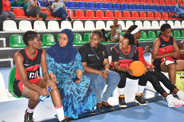 Sehemu ya wachezaji wa akiba na benchi la ufundi la Timu ya Mpira wa Pete (Netiboli) ya Ofisi ya Makamu wa Rais (Muungano na Mazingira) wakifuatilia maelekezo ya kocha watimu hiyo Bw. Mafuru Buriro wakati wa mchezo baina ya timu hiyo na Timu ya Jeshi Jeshi la Kujenga Taifa (JKT) uliofanyika katika Uwanja wa Amani Complezx, Zanzibar. Mchezo huo ulimalizika kwa Timu ya Ofisi ya Makamu wa Rais kuibuka na Ushindi wa Magoli 45 kwa 34.