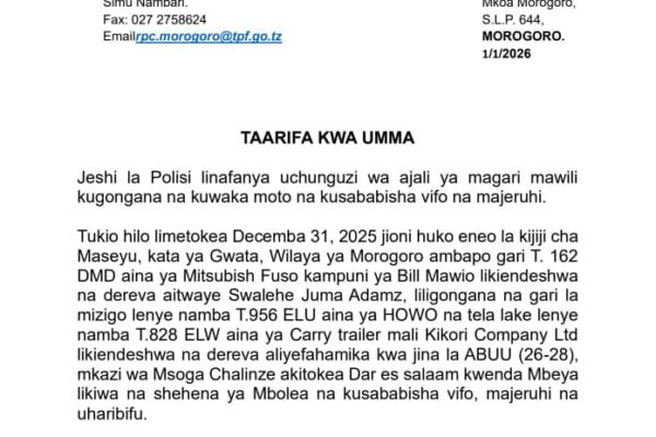 Farida Mangube Morogoro. Watu kumi wamefariki Dunia na wengine 18 kujeruhiwa katika ajali  ya barabarani iliyotokea usiku wa kuamkia leo Januari Mosi 2026 katika eneo la Mwidu Mikese, mkoani Morogoro. Ajali hiyo ilihusisha basi dogo na lori la mizigo imetokea katika Kijiji cha Maseyu, Kata ya Gwata, Wilaya ya Morogoro. Kwa mujibu wa taarifa iliyotolewa…