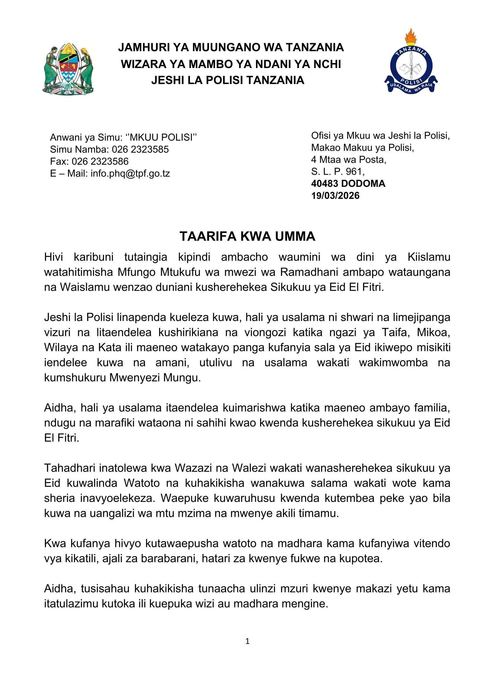 HabariPOLISI WAPO IMARA KUELEKEA EID EL FITRI Admin2 hours ago01 mins 4 Post navigation Previous: Bandari mpya Kisiwa Mgao itakavyoinua uchumi KusiniNext: HELLEN NKALANG’ANGO: Mama anayepambania kuona watoto wenye uziwi wakipata elimu