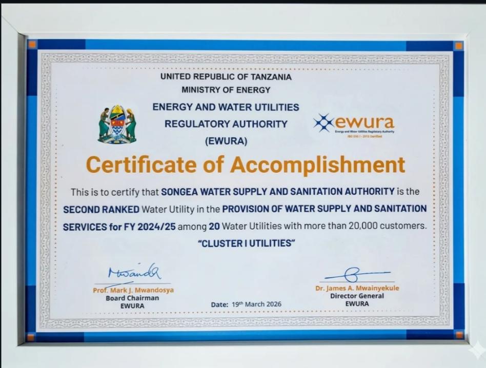 Mafanikio hayo yametokana na tathmini ya utendaji kwa mwaka wa fedha 2024/2025 inayofanywa na EWURA, ambayo hupima mamlaka za maji kwa kuzingatia vigezo mbalimbali ikiwemo ubora wa huduma kwa wateja, ukusanyaji wa mapato, upatikanaji wa maji safi na salama, pamoja na usimamizi wa miundombinu ya maji na majitaka.